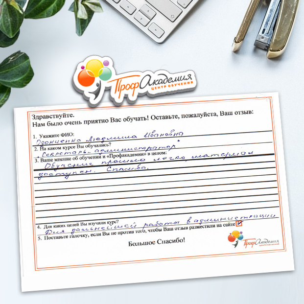 Здравствуйте! Огромное спасибо за предоставленные курсы обучения на администратора. Все очень доступно и понятно. Курсы администратора - новое направление в моей деятельности и для меня очень важно было четкое последовательное изложение материала. Благодарю за проведенное обучение и желаю успехов в профессиональной деятельности.